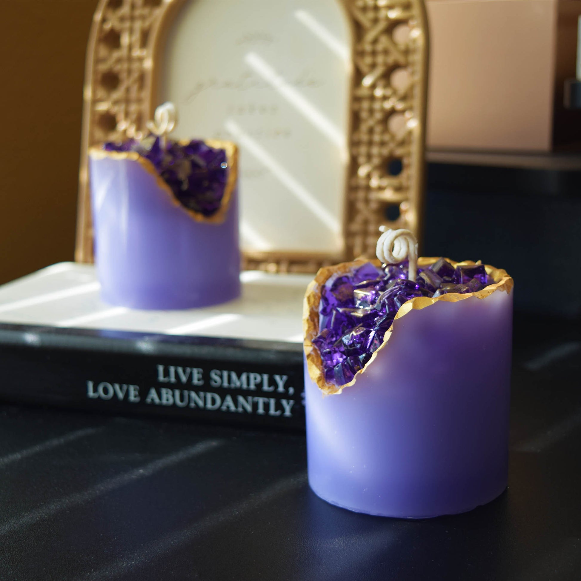 Handmade amethyst geode candle inspired by natural crystal formations. A crystal-inspired décor candle with a sculpted “amethyst” center and gold-edged geode detail—designed for home styling, meditation spaces, and meaningful gifting. Choose unscented or one of the refined fragrance options below.