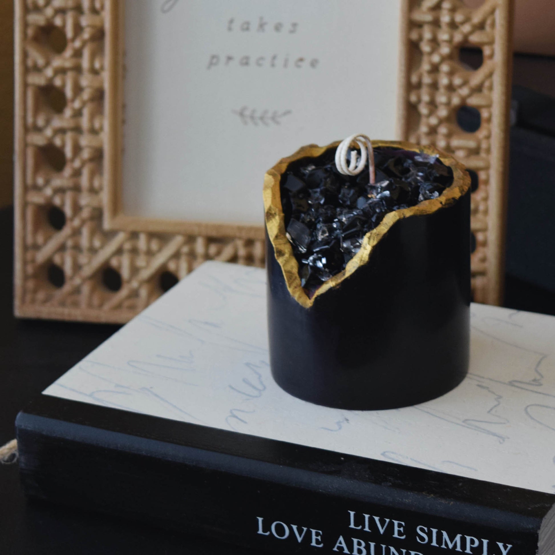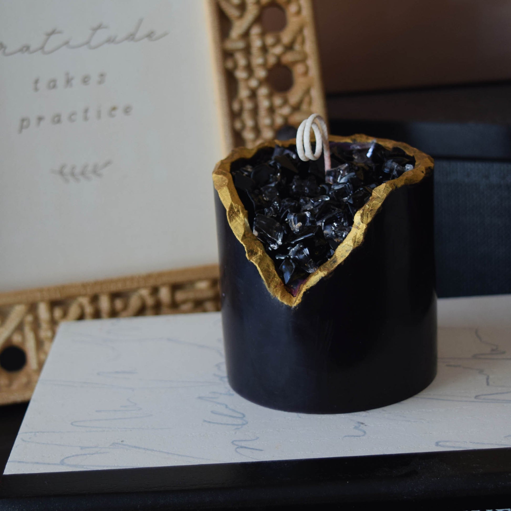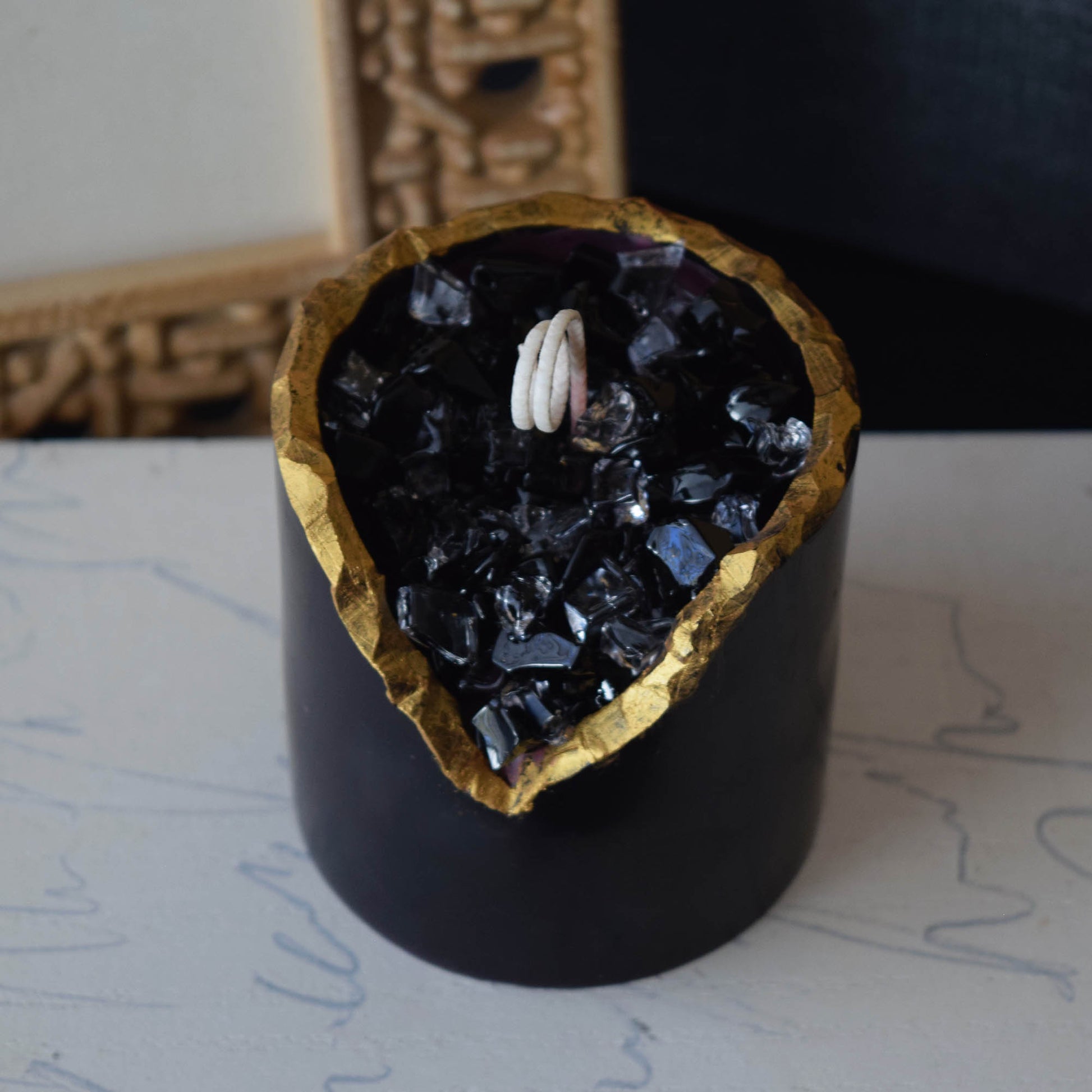 Obsidian Crystal Candle Smooth Black Geode with Gold Edge
