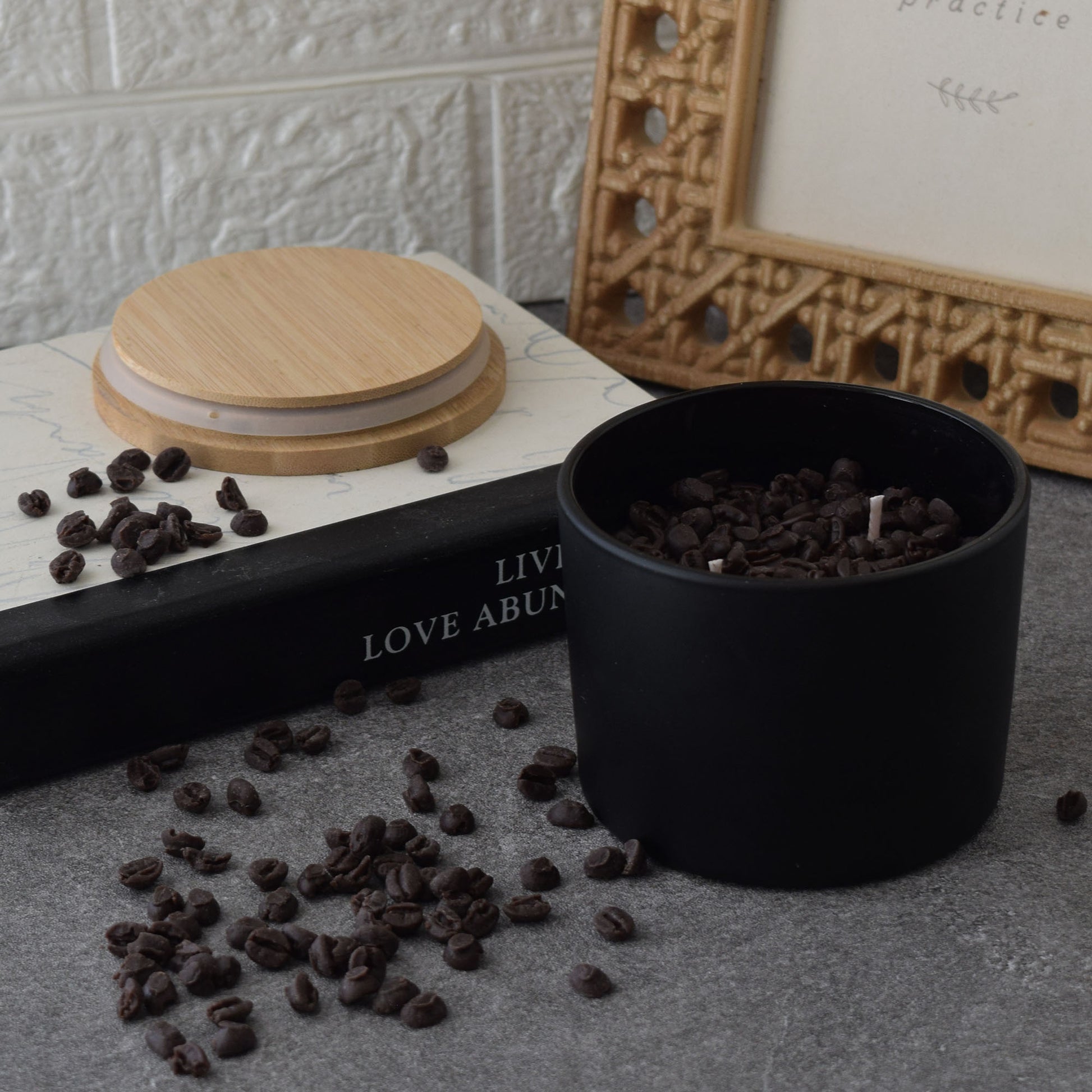 - Handcrafted coffee bean–style candle